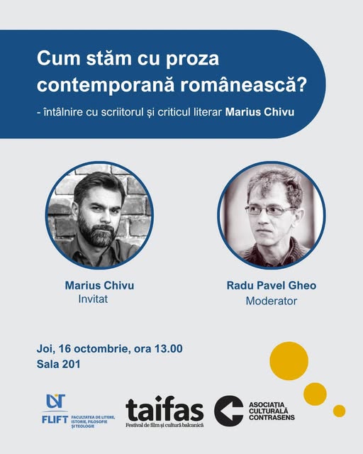 Despre acest subiect vor dezbate Marius Chivu și Radu Pavel Gheo, într-un dialog ce se va desfășura joi, 16 octombrie, de la ora 13:00, în sala 201, alături de masteranzii programului Literatură și cultură – contexte românești, contexte europene