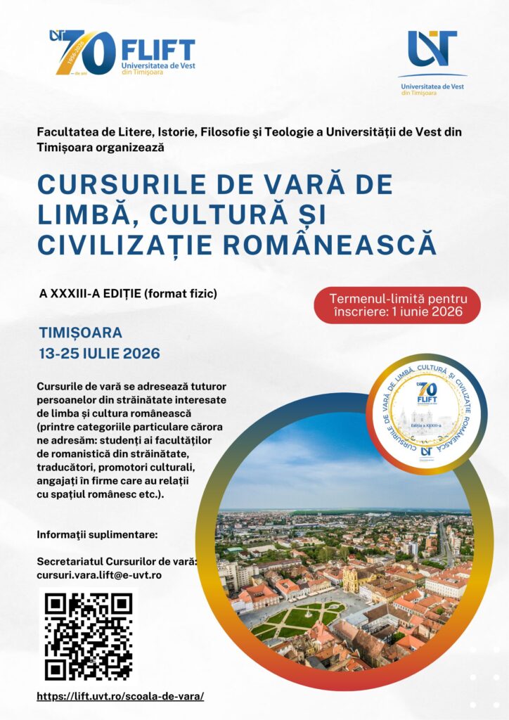 Plata taxei cursurilor Şcolii de vară se face (în perioada 2-8 iunie 2026) prin transfer bancar în contul Universităţii de Vest din Timişoara de la Banca Comercială Română, sucursala Timişoara (swift code RNCB ROBU):
